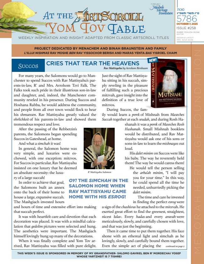 Below please find the latest edition of At The ArtScroll Yom Tov Table, containing inspiration and insight from classic ArtScroll titles.