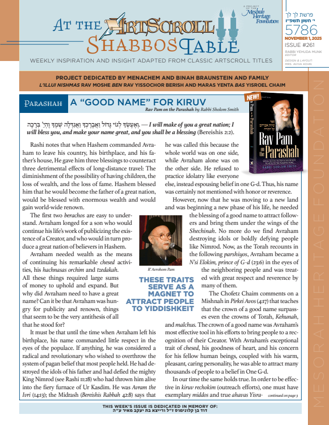 This weekly publication will contain a rich collection of stories, divrei Torah and insights that are suitable for the Shabbos table – or for anytime. We hope you enjoy and look forward to future issues, as we tap into the unparalleled treasure trove that is the ArtScroll Library, sharing the depth and beauty of our Judaic and Torah literature with you.