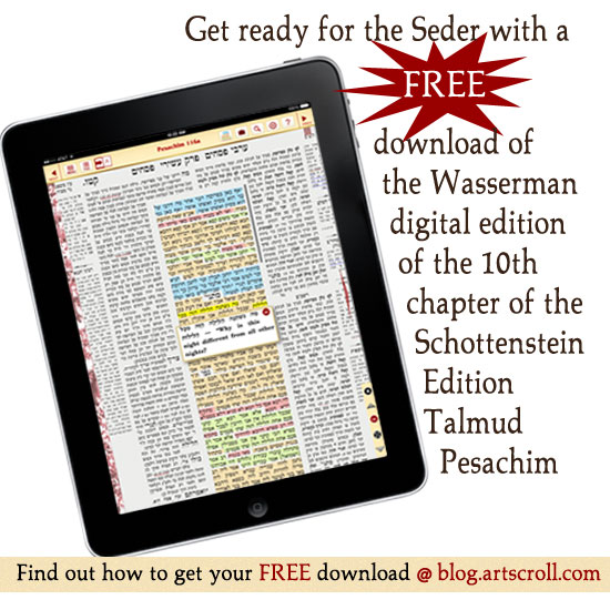 Want to try it for yourself? Here’s your chance. ArtScroll is offering a free volume. The 10th chapter of pesachim talks about the Seder, the Four Cups, the Ma Nishtana and recounting the story. It is an excellent selection to prepare for the seder.
