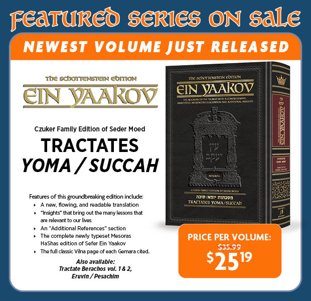 The Schottenstein Edition Ein Yaakov follows the same format as the classic Schottenstein Talmud, giving us the keys to unlock the treasures of Aggadata. Designed for maximum clarity and readability, it includes a wealth of explanation in the notes, while the “Insights” section brings out the many lessons that are relevant in our lives. It also includes the complete Mesoras HaShas edition of Sefer Ein Yaakov, including the classic commentaries, all newly typeset and vowelized. Each volume includes copies of the classic Vilna page of Gemara, for the pages of text that are covered in Ein Yaakov. The Ein Yaakov text is highlighted on the Gemara page, making it easy for those studying the daf to access this volume’s many features.