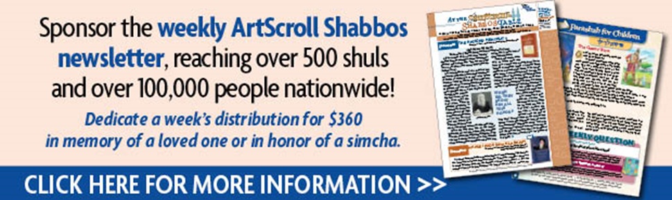 This weekly publication will contain a rich collection of stories, divrei Torah and insights that are suitable for the Shabbos table – or for anytime. We hope you enjoy and look forward to future issues, as we tap into the unparalleled treasure trove that is the ArtScroll Library, sharing the depth and beauty of our Judaic and Torah literature with you.