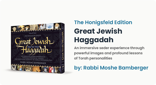 The Great Jewish Haggadah: This stunning, full-color addition to Rabbi Moshe Bamberger’s much-hailed “Great Jewish…”series brings us a Haggadah like no other – one that will ensure a meaningful and unforgettable Seder experience. The text of the Haggadah, with the classic ArtScroll translation and instructions, is clearly laid out on one side of this magnificent Haggadah. The facing page provides a scintillating thought and captivating image relating to the part of the text that is highlighted, including powerful quotes from our sages, each with a brief explanatory comment, set upon a beautifully designed backdrop of evocative photographs and images. Do you like visuals and brief but powerful ideas? You’re going to love this Haggadah! BUY NOW!