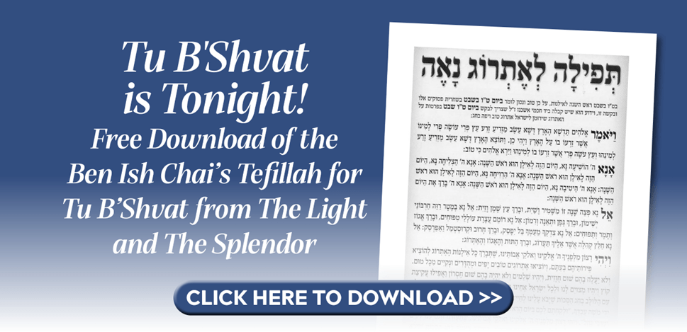 FREE Download of the Ben Ish Chai’s Tefillah for Tu B’Shvat Published on February 1, 2026 by ArtScroll Staff Share this post! Email a link to a friend (Opens in new window) Email Print (Opens in new window) Print Share on Facebook (Opens in new window) Facebook Share on X (Opens in new window) X Share on Pinterest (Opens in new window) Pinterest Share on LinkedIn (Opens in new window) LinkedIn Like Loading... Related