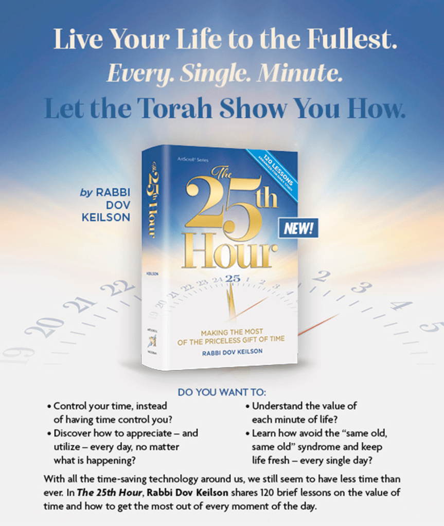Think there’s never enough time in your day for everything you want to accomplish? Think again! In The 25th Hour, an unusual blend of Torah hashkafah, chizuk, and practical ideas, Rabbi Dov Keilson, Mashigach Ruchani of Yeshiva Darchei Torah, shows us how to maximize our time.