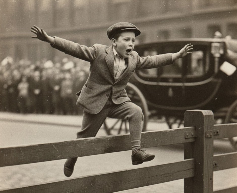 No. That wasn’t enough. So, as the royal carriage passed, he jumped the barricade.